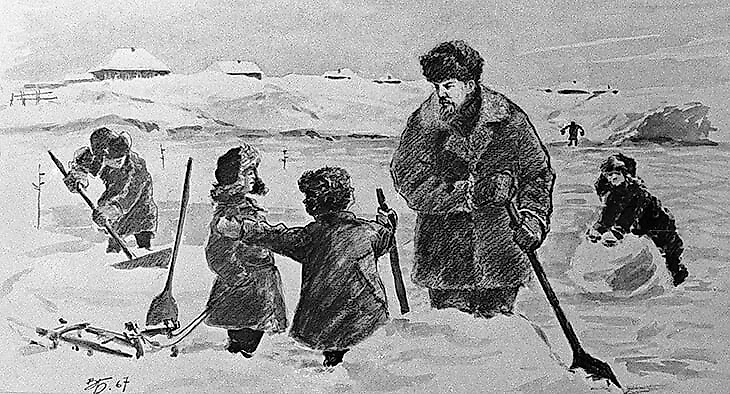 Для местной публики мы представляем даровое зрелище: дивятся на Володю, потешаются надо мной и немилосердно грызут орехи и кидают шелуху на наш знаменитый каток. Собака Дженни очень неодобрительно относится к катку, она предпочитала бы носиться по поскотине (пастбищу, выгону – Sports.ru), совать морду в снег и приносить Володе всякие редкости вроде старых лошадиных подков.