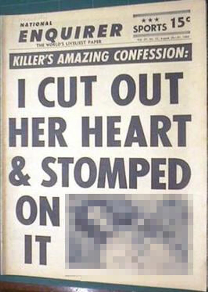 Газета National Enquire вышла с его жуткой цитатой на первой полосе: «Я вырезал ей сердце и наступил на него!». При этом на передовице опубликовали фотографию отрезанной головы Сони. Внутри газеты, на полосе со статьей, были и другие снимки расчлененного тела – вырезанное сердце, фрагмент ноги.