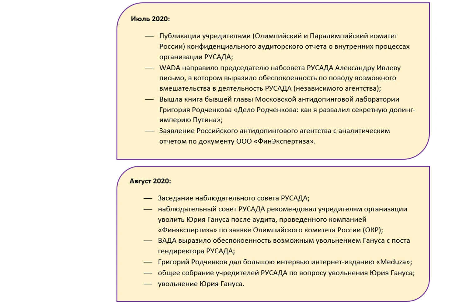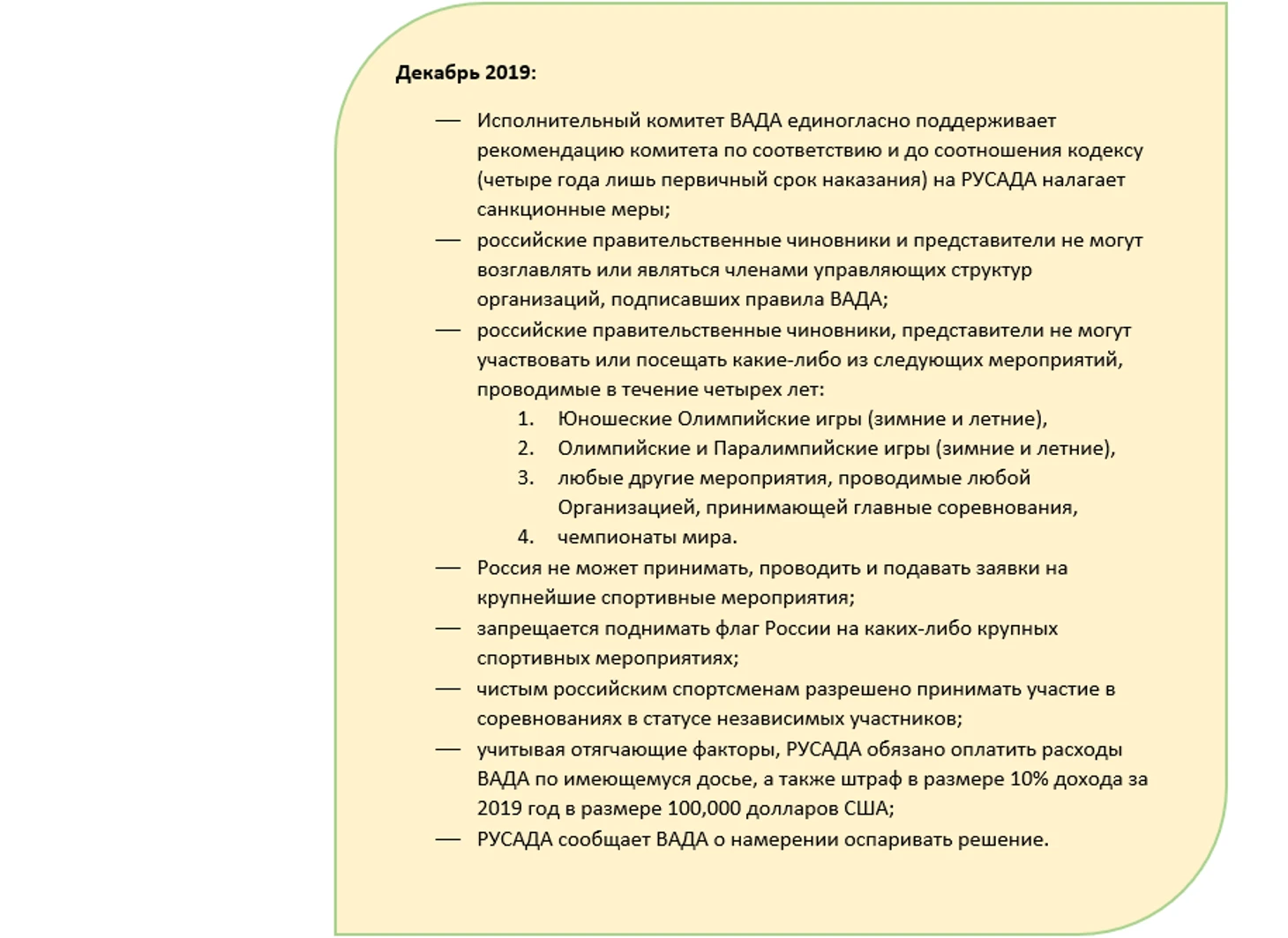 В ноябре 2020 года в Спортивном арбитражном суде состоится спор между Всемирным антидопинговым агентством и РУСАДА. В связи с событиями последнего месяца, дело может быть осложнено для российской стороны. Понять это даёт заявление ВАДА, размещенное на собственном сайте в связи с возможным (тогда еще не точным) увольнением гендиректора РУСАДА. Чем важно это решение для международного агентства? Причина все в том же соответствии кодексу организации. В своём заявлении ВАДА четко обозначило свою позицию: « Важнейшим элементом Всемирного антидопингового кодекса является то, что национальные антидопинговые организации, такие, как РУСАДА, остаются в безопасности от любого вмешательства национальных олимпийских и паралимпийских комитетов в их оперативные решения и деятельность в целях эффективного ведения своей работы. Именно поэтому Комитет ВАДА по соответствию (CRC) сделал условием возможного восстановления РУСАДА то, что ВАДА по-прежнему удовлетворено тем, что независимость РУСАДА соблюдается и нет никакого ненадлежащего вмешательства извне в его деятельность. ВАДА будет добиваться дальнейших разъяснений от российских властей и рассмотрит любые другие шаги, которые могут потребоваться после обсуждения этого вопроса с Комитетом по соответствию».