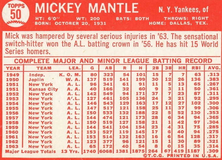 Поначалу это была лишь строчка о том, как спортсмен провел прошлый сезон, но с 1957-го там начали помещать статистику за все годы. Компания Bowman (самый известный конкурент Topps в то время) сразу же скопировала эту идею, и через несколько лет уже практически все спортивные карточки содержали статистику.