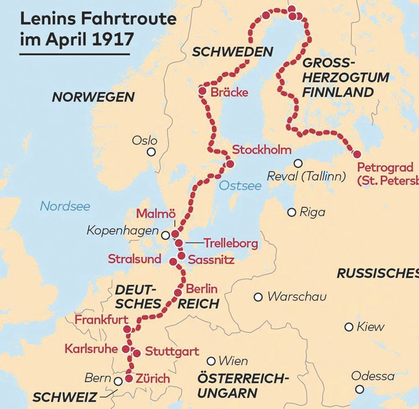 Ленин ошибся. Первой страной, где коммунисты пришли к власти и ее удержали, стала именно Россия – при непосредственном участии Ульянова. Февральская революция 1917-го и падение монархии застали его в Швейцарии. В Петрограде объявили амнистию, поэтому большевики могли вернуться из эмиграции на родину. С этим событием связано третье знаковое появление Ильича в Германии, когда Ленин пересек всю страну с юга на север в так называемом «пломбированном вагоне». Поезд проследовал через Штутгарт, Мангейм, Франкфурт, Ганновер, Берлин и Штральзунд, где Ленин пересел на паром до Швеции.