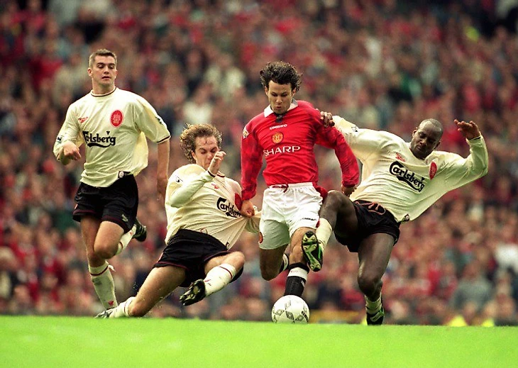 12 октября 1996. Манчестер. Райан Гиггз во время дуэли с двумя игроками "Ливерпуля" Джейсоном Макатиром (слева) и Майклом Томасом (справа) на "Олд Траффорд"