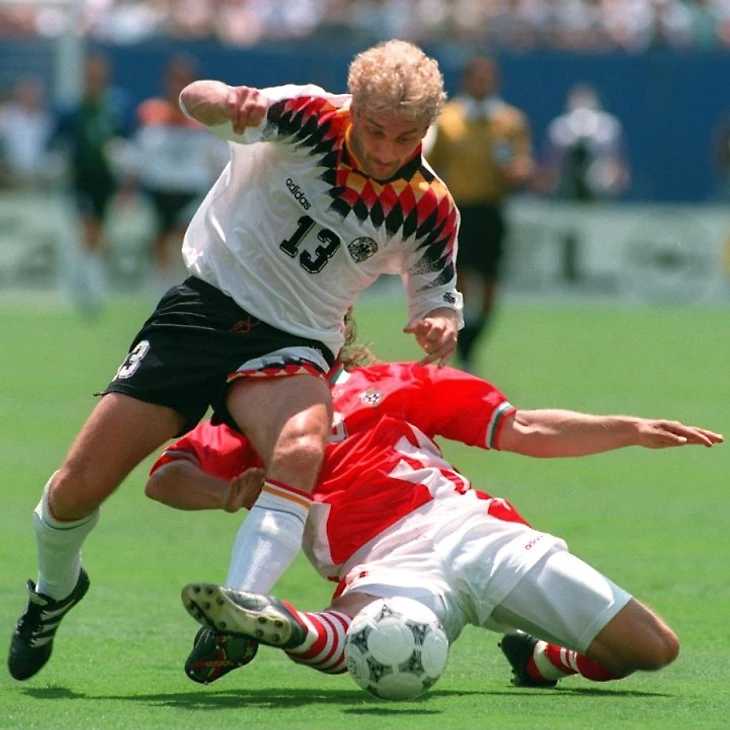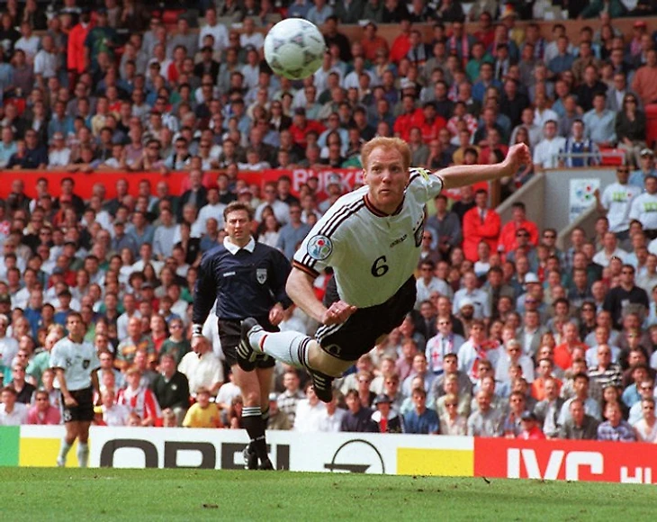 23 июня 1996. Манчестер. Четвертьфинал Чемпионата Европы. Полет Маттиаса Заммера, забившего в этом матче победный гол.