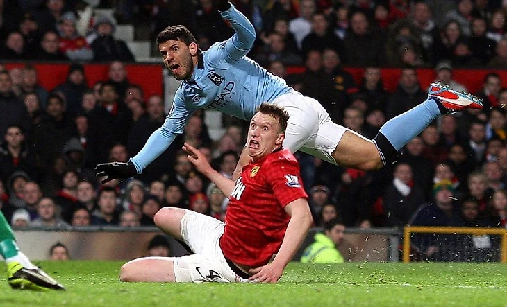 08 апреля 2013. Манчестер. Серхио Агуэро забивает победный гол на "Олд Траффорд". Однако вся слава от этого фото досталась Филу Джонсу