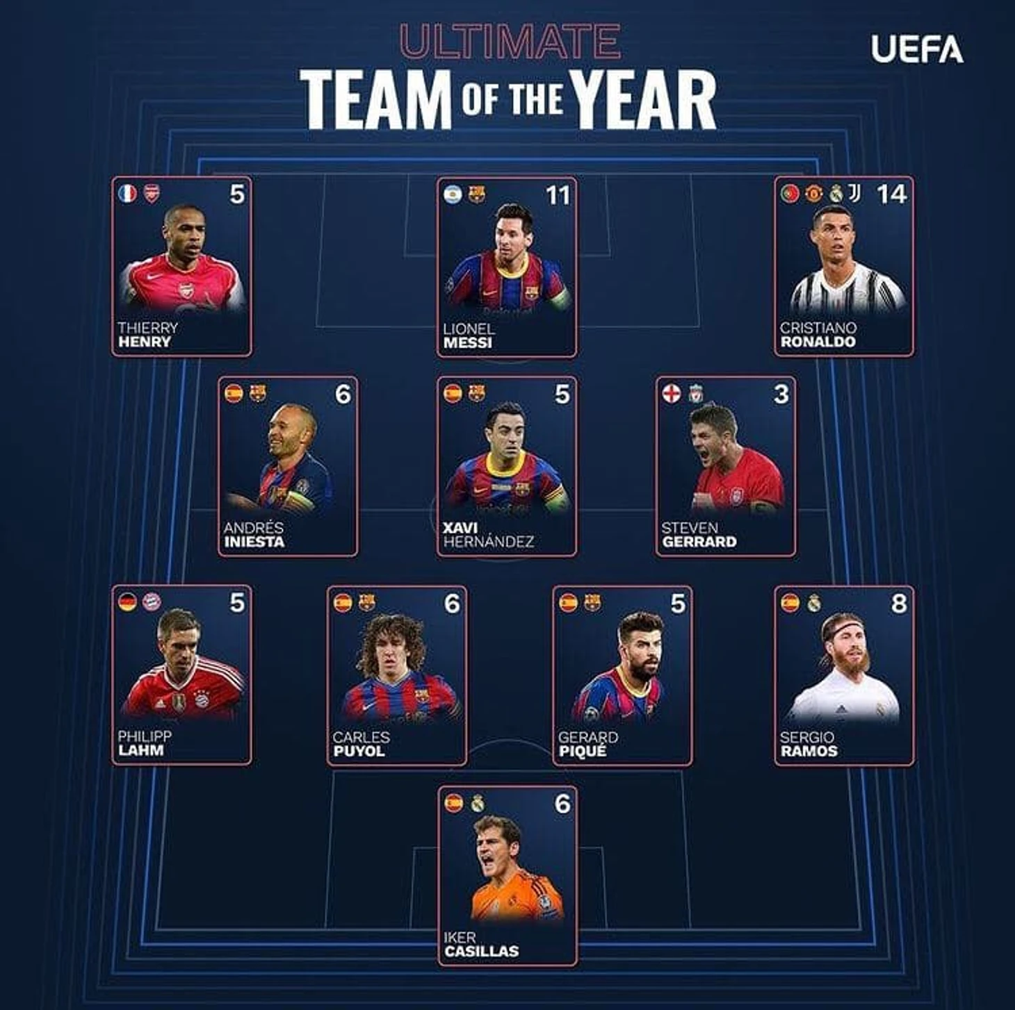 В сборной присутствуют игроки, попадавшие в команду года от УЕФА наибольшее количество раз (с 2001 года)
