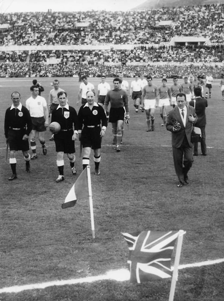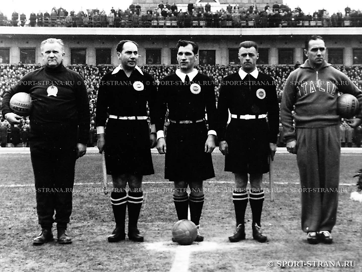 24 мая 1961. Рим. Латышев с ассистентами Николаем Балакиным (слева) и Николаем Хлопотиным выводят на поле сборные Италии и Англии. Англичане выиграют 3:2.