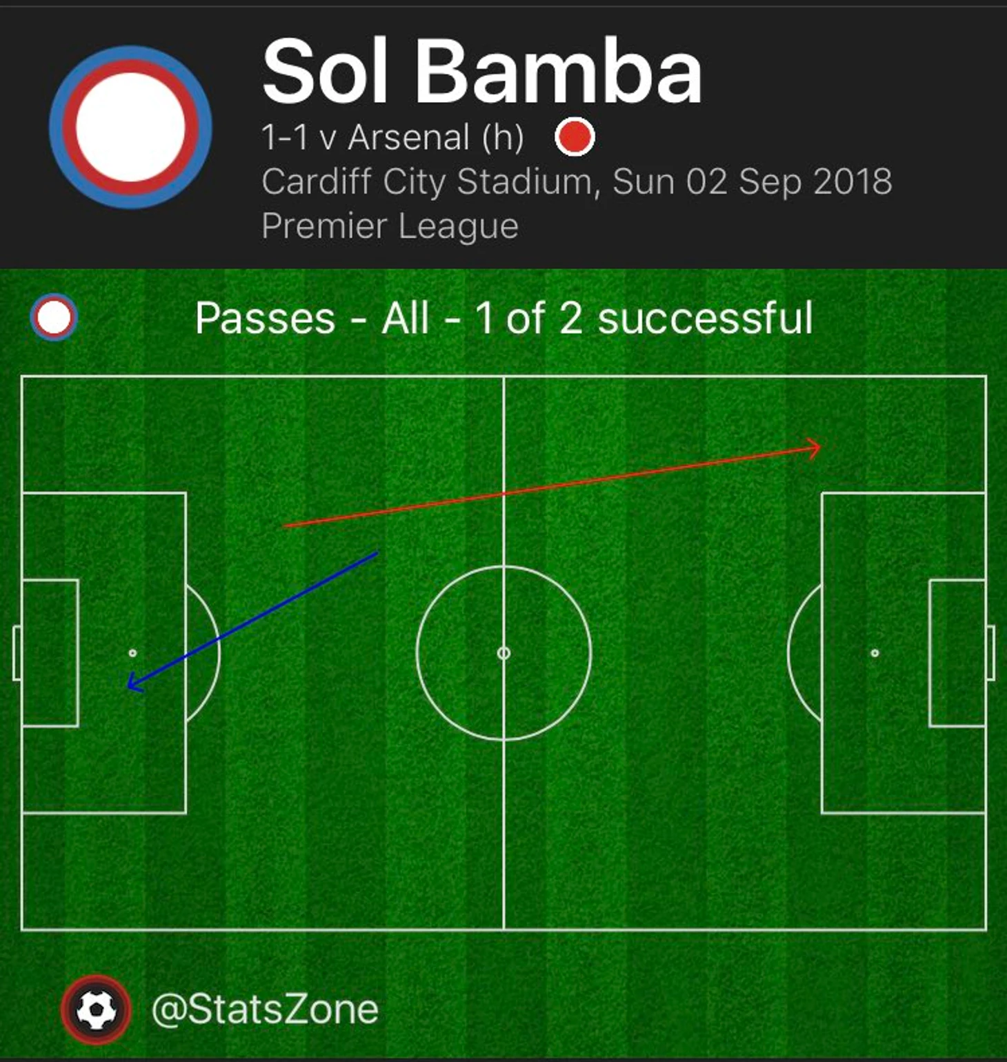 "Кардиффу" удалось свести первый тайм к ничье. Центральный защитник Сол Бамба за 45 минут совершил 2 передачи с 50% брака