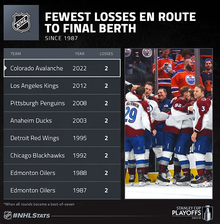 Так что, у «Эвеланш» много чего есть, и они являются идеальным соперником для команды, претендующей на "династию". Они уже сделали два свипа чтобы добраться в финал, они доказали свою способность дать бороться в каждом матче. «Колорадо» выиграли шесть из семи игр в этом плей-офф, где они пропустили первыми, что в два раза больше, чем у всех других команд, и единственные с процентом побед выше 50% в таком сценарии.