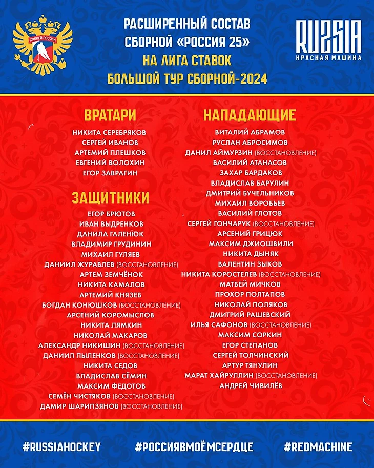 ФХР представила расширенный состав «России 25», которая под руководством Романа Ротенберга отправится в Большой тур Сборной. Большим это турне считается лишь формально: матчи пройдут со 2 по 11 мая лишь в четырех городах. Команда сыграет в Астане, Омске, Туле и Минске.
