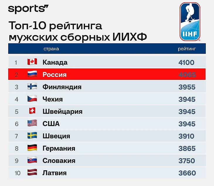 Первое место сохранила сборная Канады, на третьем расположилась Финляндия. Благодаря победе на ЧМ подскочила в рейтинге и заняла четвертое место Чехия. Больше всего обсуждений вызвал факт, что сборная России поднялась на вторую строчку. У нее в активе 4065 очков.