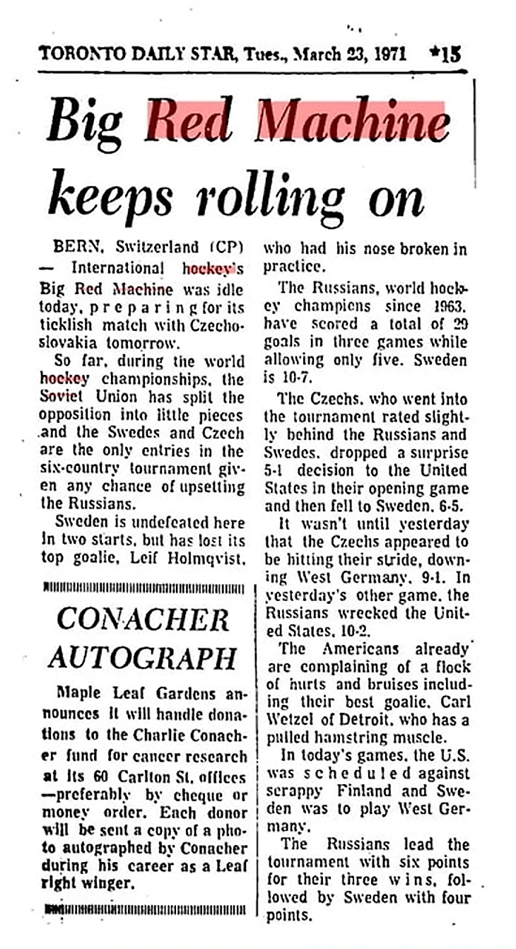 Самым ранним упоминанием «Красной машины» считается заголовок в мартовском номере канадской газеты Toronto Daily Star из 1971-го. Тогда в Швейцарии сборная СССР взяла девятое золото подряд на ЧМ и установила рекорд по победной серии. Видимо, такой результат натолкнул журналистов на новое сравнение.