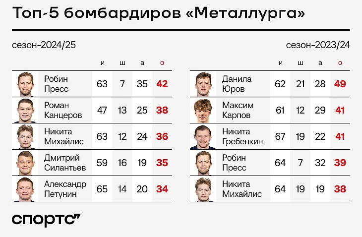 Новые лидеры «Металлурга» поддерживают уровень прошлогодних бомбардиров. Ушедших Карпова и Гребенкина заменили прогрессирующие Силантьев и Канцеров. Силантьев после дебютного сезона (11 очков) заметно превзошел собственный результат (35 очков). Такая же ситуация и у Канцерова: результат из регулярки-2023/24 (15 очков) улучшил больше чем в два раза (38 очков).
