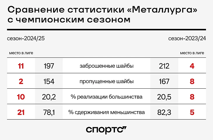 Что важнее – положение команды относительно соперников. Глобально «Магнитка» не стала хуже играть в атаке, но в общей таблице регулярки получила лишь 11-е место по заброшенным шайбам (197). На этом фоне выручает только надежная защита (154 гола) – «Металлург» идет вторым после оборонительного «Локомотива» (122).
