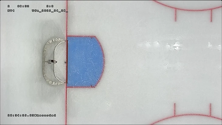 Вид сверху – самый объективный. Здесь меняются положение зрителя (над воротами) и фон (красная линия). Соответственно, толщина льда не мешает увидеть момент таким, какой он есть на самом деле. Край шайбы лежит на ленточке, поэтому гола нет.
