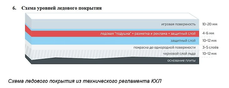 В техническом регламенте КХЛ указано, что игровая поверхность льда над рисунком составляет 10-20 мм. Из-за этого сбоку толщина льда создает оптический эффект. Кажется, что между шайбой и линией появляется расстояние. На самом деле это свободное пространство над линией, которое со стороны сливается в одну плоскость.
