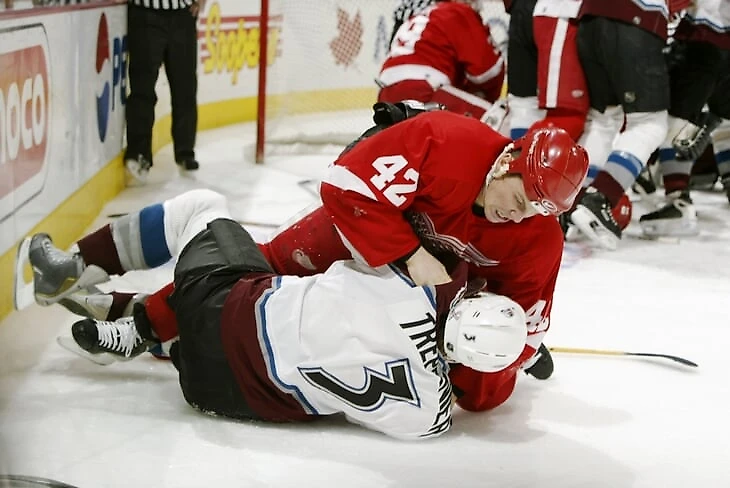 Я следил за Маккарти, потому что собирался играть в его манере. Мак был пижоном в стиле наркоторговца из 70-х, которых полно в старых сериалах про ментов, типа «Старски и Хатч». Он и одевался так, будто на дворе были 70-е – шмотки в клетку, побрякушки всякие. Шума больше, чем стиля. Да, в свое время его выбрали во втором раунде, а за «Детройт» он играл с 1993 года. Но играл он в так называемый «жесткий хоккей» (то есть играет в тело и дерется, но может и забить) – в такой же, как и я. Моя стратегия заключалась в том, чтобы играть против Мака не менее жестко – как наждачка против наждачки. К тому же мы тренировались с ним в одной группе, так что мне казалось, я могу проявить себя перед начальством.