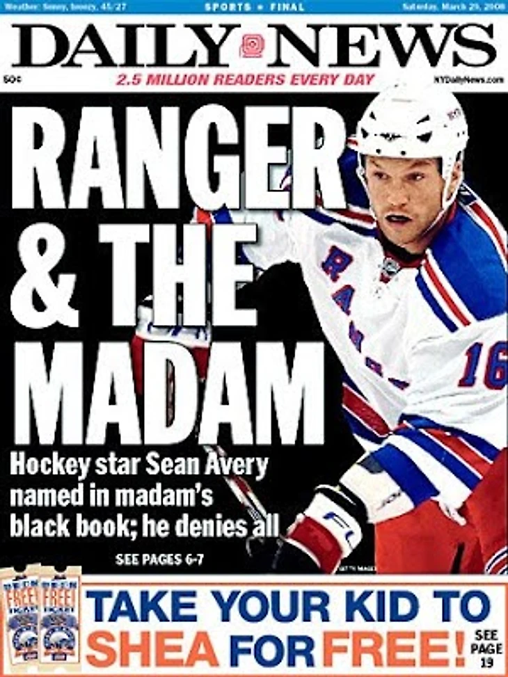 «Имя и номер мобильного телефона звезды «Рейнджерс» Шона Эйври были обнаружены в маленькой черной книжке манхэттенской мамочки Кристин Дэвис», – радостно кукарекала Daily News. «27-летний силовой форвард Эйври любит вывалить мусор на соперников и встречается с рядом моделей и актрис. В списках борделя Maison de L’Amour он числится в графе 500-долларовых клиентов».