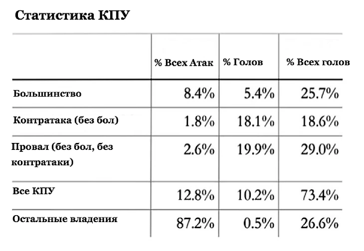 Команды забрасывали по 2,78 гола за матч. На владения КПУ пришлось 2,04 из них, а на остальные типы владения лишь 0,74.