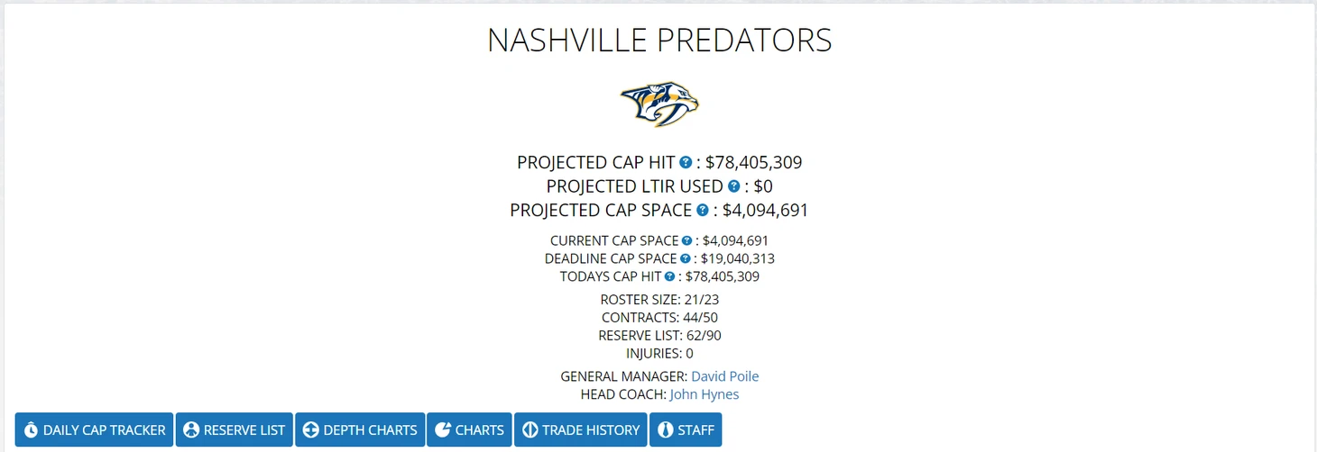 У «Нэшвилла» всё хорошо с кепкой, даже ещё останется немного места после подписания Тренина. Шикарный вратарь, очень сильная линия защиты, но я не отнёс их в число фаворитов на Кубок Стенли. Более того, с текущим ростером нападающих я в принципе не могу этого сделать в обозримом будущем. Учитывая уровень оппозиции даже внутри дивизиона, поставили бы вы на Дюшена и Форсберга против Ландескуга, Маккиннона и Раантанена? А против О’Райлли сотоварищи? Команда, которая железно может попадать в плей офф - да, вижу её развитие. Команда, которая в обозримом будущем будет претендовать на кубок - точно нет. Буду рад ошибиться, ведь НХЛ тем и прекрасна, что количество претендентов не ограничивается двумя - тремя клубами.