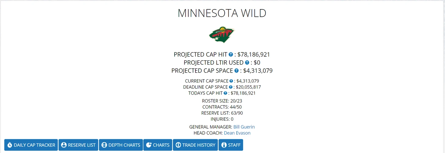 Миннесота - «Хьюстон, у нас проблемы!» - знаменитая фраза из боевиков моей юности очень хорошо отражает положение дел в команде из самого хоккейного штата США. Капризов, подобно Овечкину в Вашингтоне, изменил всё в «Миннесоте». Из не самой медийной команды, никому особо не интересной за пределами Штата Миннесота, «Дикари» вдруг стали одной из самых интересных команд лиги, с быстро растущей фан базой по всей Северной Америке и России. Если бы я составлял рейтинг в прошлом году, команда была бы в числе претендентов на победу в Кубке Стенли. В этом году я понижаю их в блок участников плей офф, а в следующем не исключаю того, что придётся понижать дальше. Причина здесь проста - у «Миннесоты» большие проблемы с потолком зарплат и сейчас мы рассмотрим их более подробно.