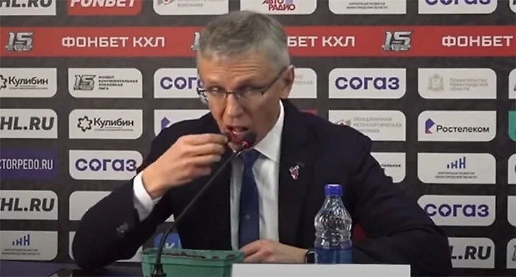 Главный тренер «Торпедо» впервые засветил малину еще осенью 2022-го. После игры «Торпедо» и минского «Динамо» (5:2) он взял с собой на пресс-конференцию контейнер с нижегородской малиной. Объяснил это снятием стресса: «Бокал хорошего красного вина был бы лучше, но после игры очень сложно получить удовольствие от этого напитка. Поэтому малина заменяет».
