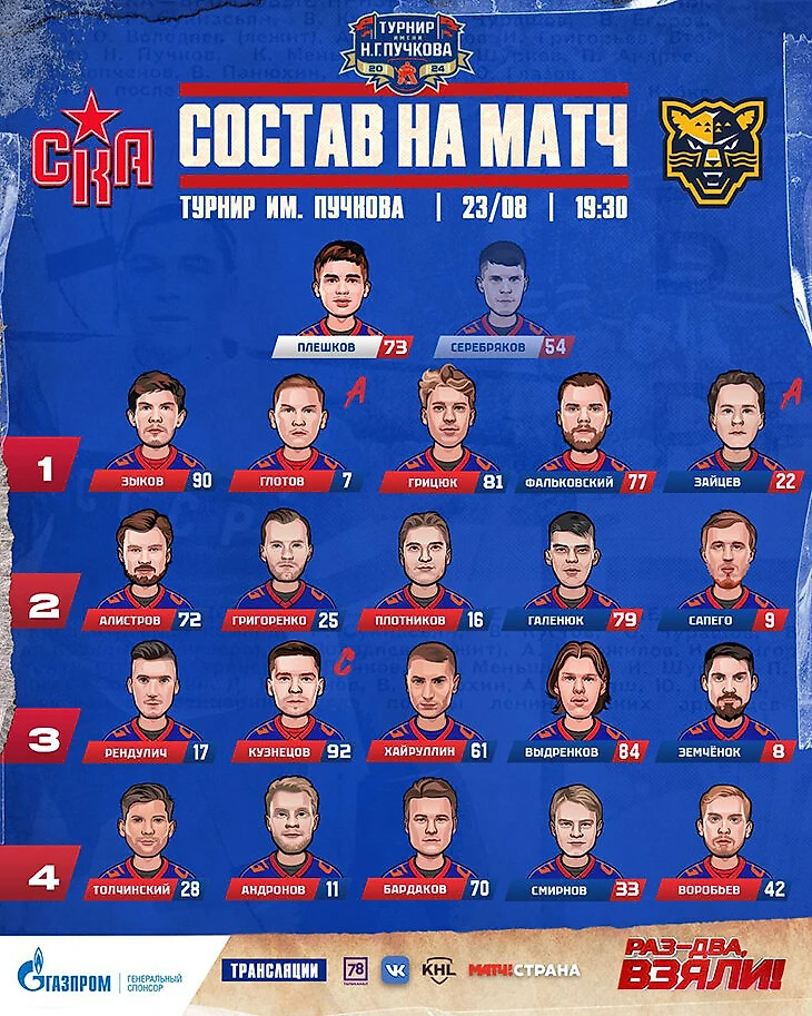 1. Состав СКА по именам смотрится мощнее, чем у любого клуба КХЛ. Михаил Воробьев попал в заявку 13-м форвардом. В официальных матчах это место наверняка займет лимитчик Иван Демидов – на турнире имени Пучкова он выступает капитаном молодежной сборной России. Ротации не избежать: сейчас особенно ощущается привычный перебор статусных игроков.