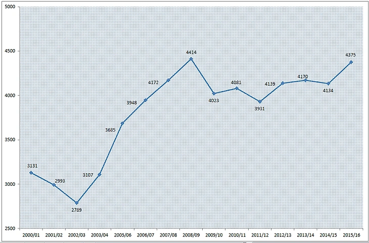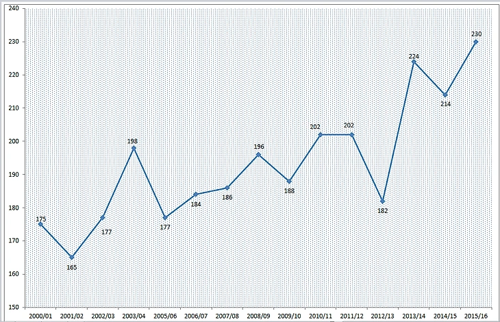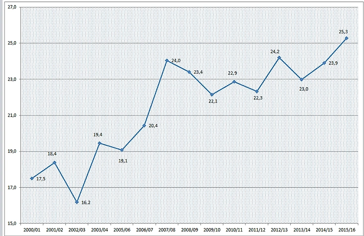 Как видно на графике, за последние 15 лет количество молодых игроков (до 23 лет), которые набирали очки, увеличилось почти на треть.