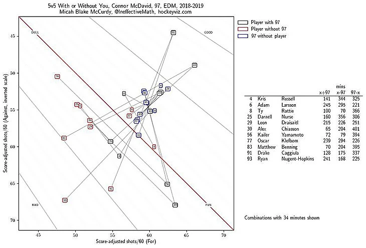 Вот график, который показывает уровень партнеров Макдэвида. Даже Нюджент-Хопкинс, играя не с первым центром, в разы ухудшает свою бросковую статистику (красные квадратики – как играет хоккеист без Макдэвида, черные – как рядом с ним; чем ближе к верхнему правому углу, тем лучше).