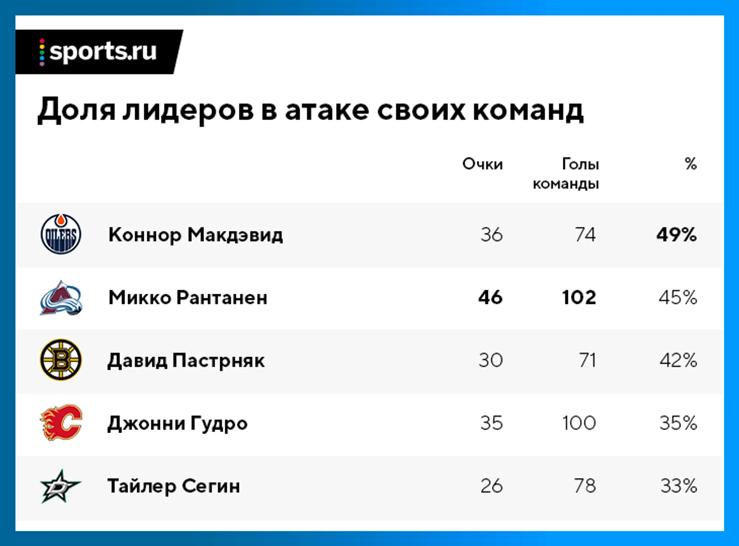 В итоге сейчас «Эдмонтон» зависит от Макдэвида больше, чем любая другая команда от своего лидера. Это видно даже в сравнении команд, которые сильно ассоциируются со своими первыми тройками: