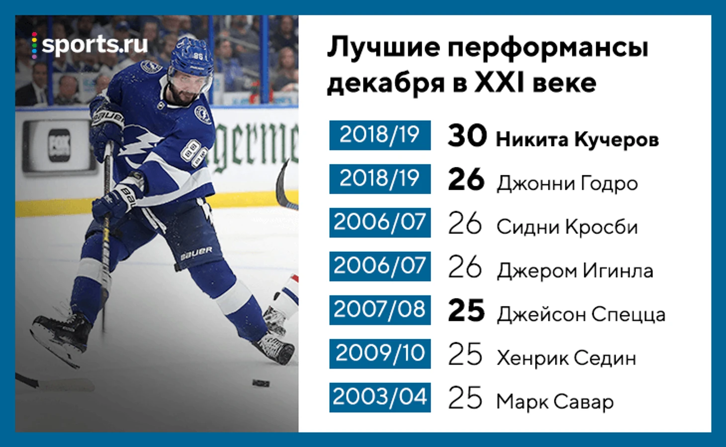 Кучеров провел лучший декабрь в XXI веке с солидным отрывом от второго места. У него сменились оба партнера (были Наместников и Стэмкос, а стали Пойнт и Джонсон), но он все равно жарит по максимуму – а это значит, что любые смешные разговоры о зависимости Кучерова от партнеров, которые ходили в прошлом году, стоит забыть. Развеселая «Тампа» гонит по регулярке, забивая столько, сколько хочет сама.
