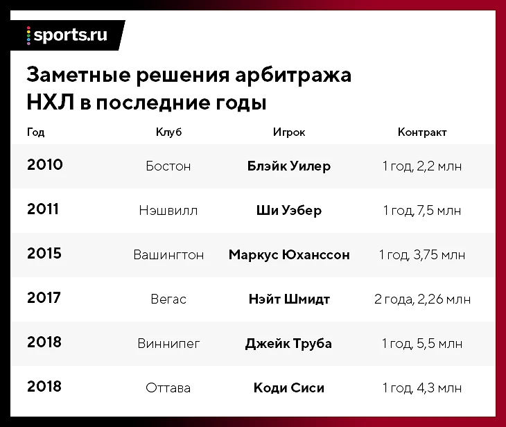 Право подать заявку в арбитраж имеет и клуб, но это случается крайне редко. Последним это делал «Детройт» в 2016-м, когда не удалось договориться с голкипером Петром Мразеком. Но и тот случай тоже был разрешен до суда.
