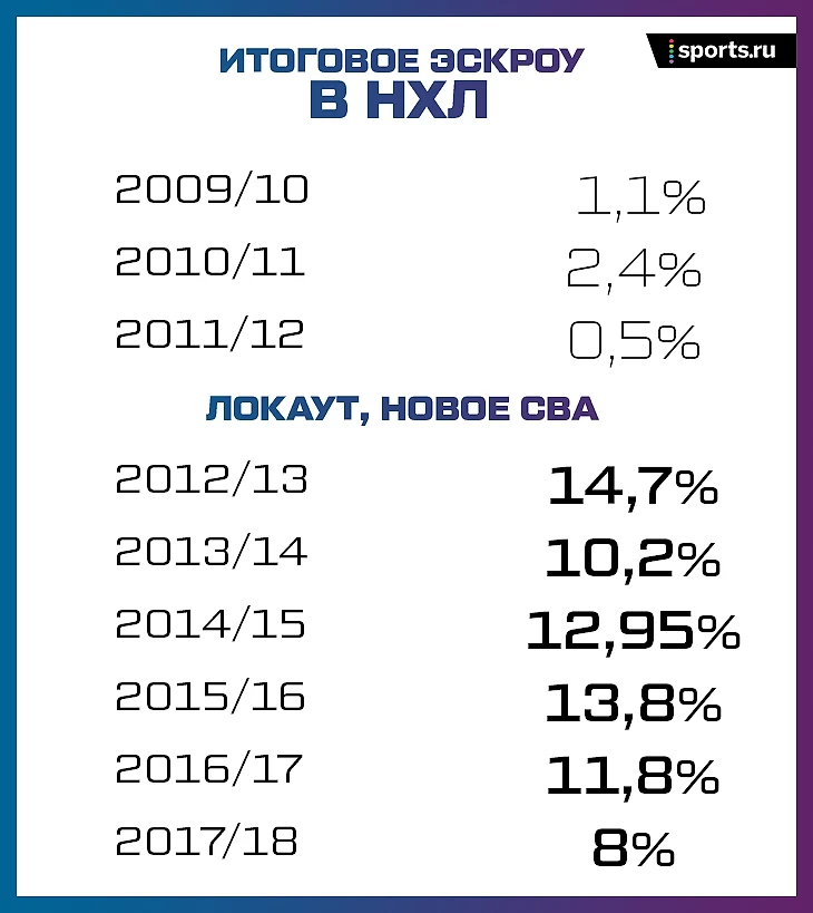 Эскроу есть даже в финансово суперуспешной НБА, где игроки могут получить чуть больше хоккеистов (51%), но система работает точно так же — только вот почти все эскроу, забранное перед началом сезона, потом возвращается баскетболистам (в худшем случае они обычно теряют сущую мелочь). В НБА сводят дебет с кредитом намного лучше.