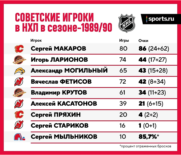 Легально — через Совинтерспорт, как упомянутые выше, или нелегально, как Фетисов и Могильный, до НХЛ в сезоне-1989/90 добрались восемь полевых игроков и один вратарь.