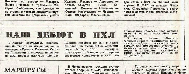 Перед тем, как отправить Гагарина в космос, советские конструкторы провели два репетиционных запуска собак и манекена Ивана Ивановича. Хоккейным Иваном Ивановичем стал Сергей Пряхин, капитан «Крыльев Советов», который до этого был задрафтован «Калгари» в 12-м раунде. «Огонькам» Пряхин на самом деле не был особенно нужен — сильнейшая команда НХЛ ждала Сергея Макарова. Советские люди не хотели сразу же бросаться в неизвестность — и в космос первым полетел Пряхин.