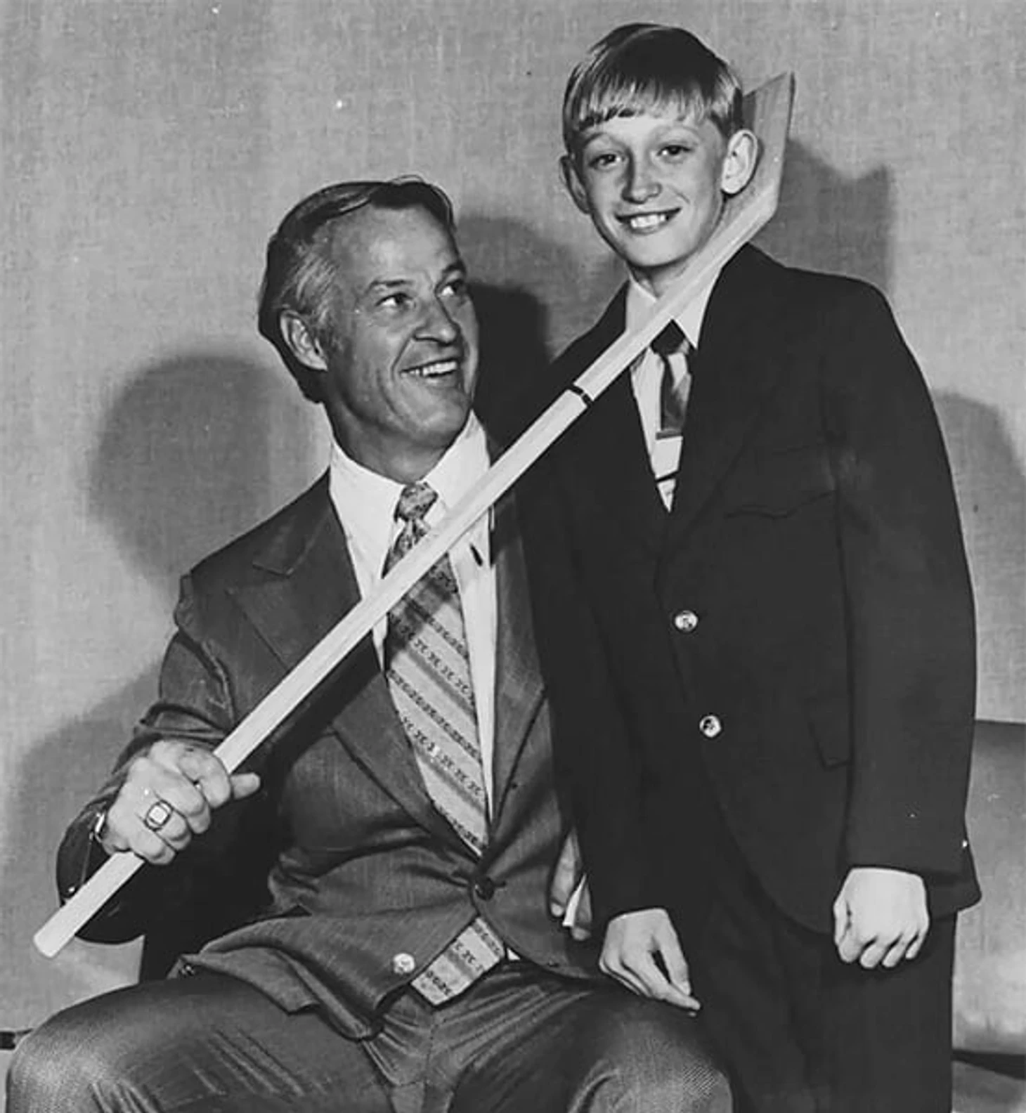 Если составлять топ легендарных хоккейных фото, то вряд ли кто-то сместит с первого места «полет» Бобби Орра в финале-1970. Но очень близко в списке будет снимок с Горди Хоу, который крюком клюшки как будто захватывает голову 11-летнего Уэйна Гретцки.