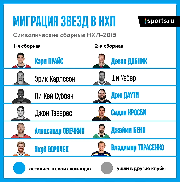 Звезды теперь редко меняют прописку в НХЛ. Рынок свободных агентов — убожество. Появление там Тавареса два года назад (игрока, который до этого лишь два раза набирал больше очка за сезон) стал событием тысячелетия, потому что раньше на рынок не выходили игроки примерно такого уровня и возраста. 1 июля в НХЛ только переплачивают ролевикам из третьих звеньев.