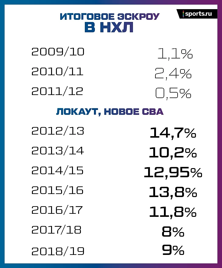 Бухгалтеры НХЛ справляются хуже. Перед этим сезоном эскроу был заложен в размере 14% – сильный рост по сравнению с двумя последними годами (11%). Прогноз по прибылям достаточно консервативен, и лига компенсирует игрокам прибыль сверх ожиданий. Например, летом 2018-го НХЛ забрала у игроков 11,5%, а несколько дней назад стало известно, что возвращает обратно 3%.