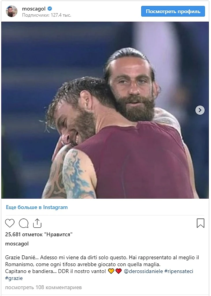Нападающий Пизы из третьего дивизиона Давиде Москарделли тоже проводил Де Росси трогательным постом в инстаграме. Форвард написал «Спасибо, Дани» и «ДДР (то есть Даниеле Де Росси) – наша гордость!».