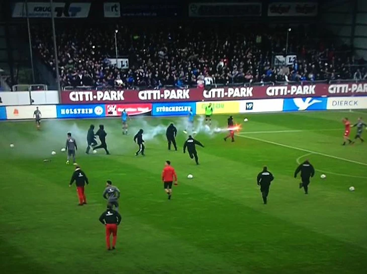Неприятности начались, когда домашние болельщики штурмуют поле и прорываются, к гостевому сектору фанатов Санкт -Паули. Во время хаоса болельщики Санкт -Паули теряют свой флаг или часть флага, но фаната ловят игроки Холштайна Кильский  и вернули тряпки фанатам Санкт -Паули. В прошедшие выходные ультрас Киля были атакованы неизвестными перед родным стадион.
