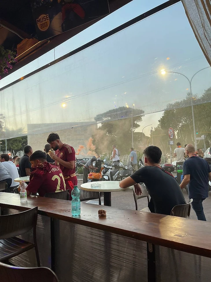 Первая остановка — достаточно популярный в Риме уличный бар Fischio, находится рядом со станцией метро Cipro. Разливная «Стелла Артуа» за 3,5 евро и приятная атмосфера подкупают не только меня, поэтому летом там всегда многолюдно, особенно перед матчами. Многие болельщики заезжают в Fischio, чтобы выпить, встретиться с друзьями и вместе пойти на стадион. Время поджимало, так что задерживаться в баре надолго я не стал.