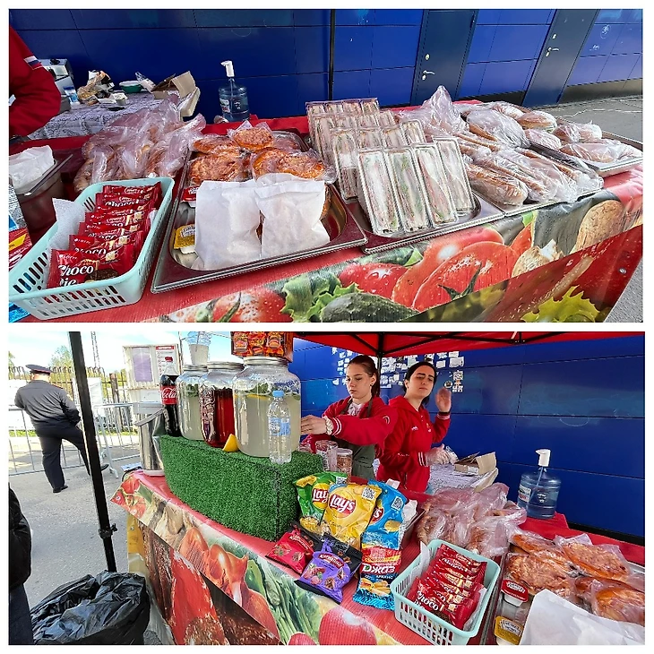 Перед входом на стадион стоит небольшая палатка-буфет. В продаже мини-пиццы, хот-доги, пирожки, сэндвичи, чипсы, сухарики и лимонады. Выпечка и лимонады домашние. Цены, разумеется, демократичные. Мини-пицца и лимонад обошлись в 150 рублей. Было вкусно!