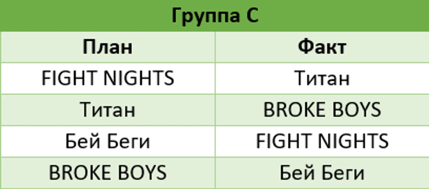 Первый тур, когда все стали играть не в рамках одной группы, а с другими соперниками. Группа А играла против Группы В и Группа С против группы D. Всё же логично? Логично. Давайте смотреть были ли результаты логичными.