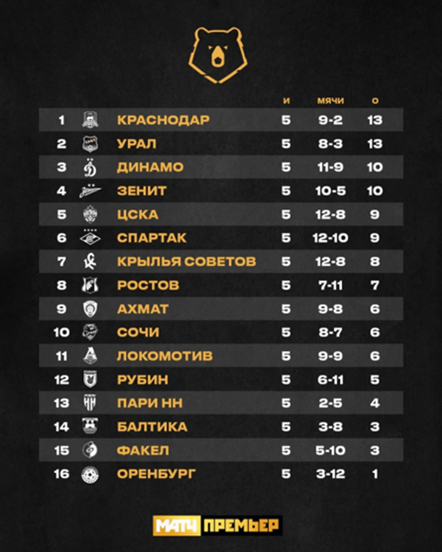 В Российской Премьер-Лиге (РПЛ) прошли первые 5 туров, а это ни много ни мало - 1/6 всего сезона и, как мне кажется, время подвести первые итоги. Далее будет краткое личное мнение по командам, с 1 по 16 место.