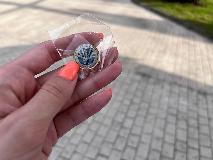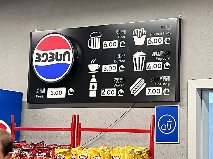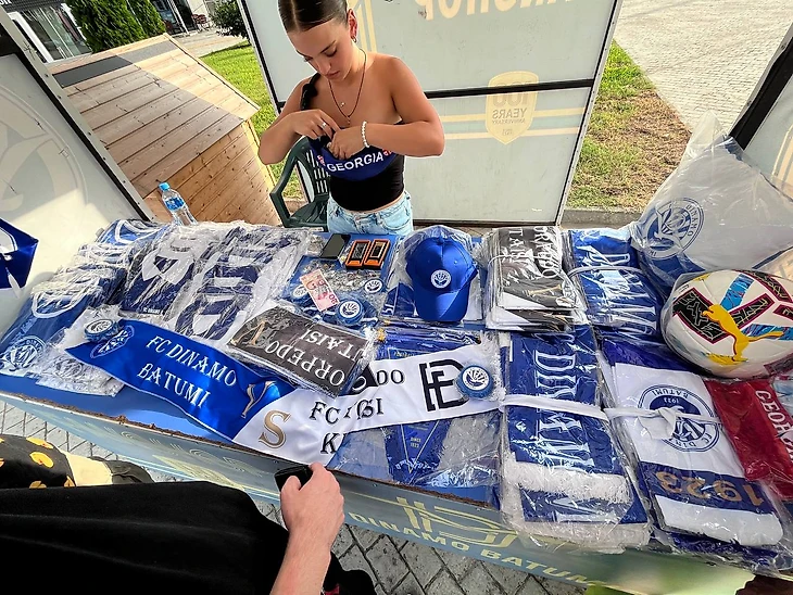 На стадионе есть два бара, но нет фан-шопа. В день матча стоял небольшой ларек (но с гордой надписью FANSHOP), в котором можно было приобрести футболки, шарфы и небольшие сувениры. Я, по своей традиции, купила значок. Стоил 5 лари. Футболки по 40 лари.