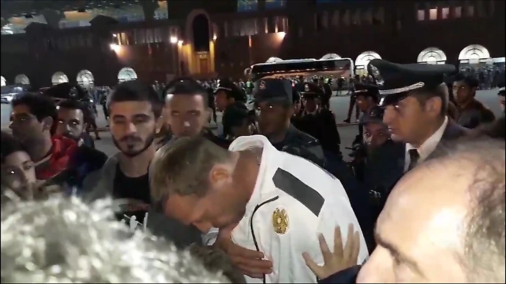 Вместо футболистов сборной Армении, с которыми болельщики требовали встречу, вышел легендарный Роман Березовский и поклоняясь попросил у них прошения за поражение.