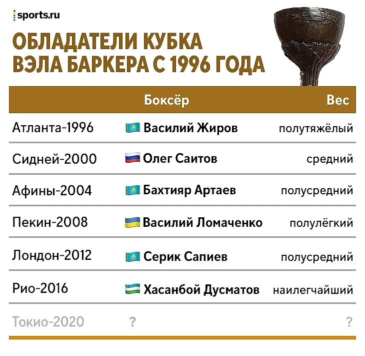 Любопытная закономерность: начиная с 1996 года (когда независимый Казахстан впервые поучаствовал на Олимпиаде), наши боксеры каждые вторые Игры увозят домой Кубок Вэла Баркера – приз, уже более восьмидесяти лет вручаемый лучшему боксеру турнира.