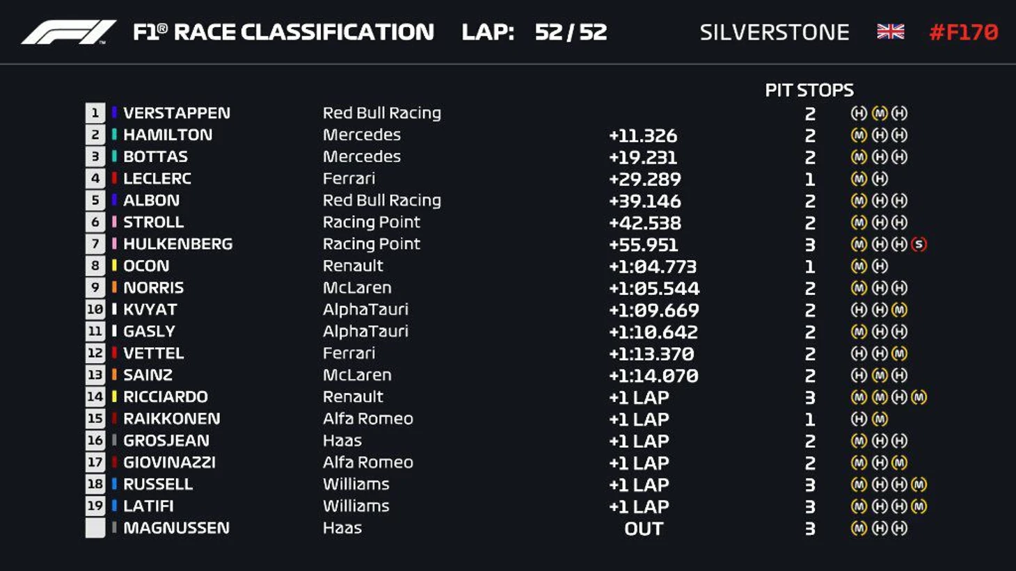 Оба Мерседеса - на первом ряду, но с поула стартовал Боттас. Финн удерживал лидерство до первой волны пит-стопов, далее шёл Хэмильтон, за ним - Ферстаппен, на старте прошедший Хюлькенберга. Важный момент: Макс стартовал на жестких шинах, а лидеры - на средних. Альтернативная стратегия (задатки которой чуть было не привели к краху во втором сегменте квалификации) позволила Ферстапенну пересидеть Льюиса, обойти за счёт разницы в свежести шин Вальттери и оставить обе «чёрные стрелы» позади. Ещё более смелая (наверное, даже сумасшедшая) стратегия привезла Леклера на четвёртое место. Албон под конец гонки забрался на пятое. Оба «розовых Мерседеса» оказались далеки от подиума, Феттель и Риккьярдо развернулись, а Квят набрал очко и опередил Гасли.