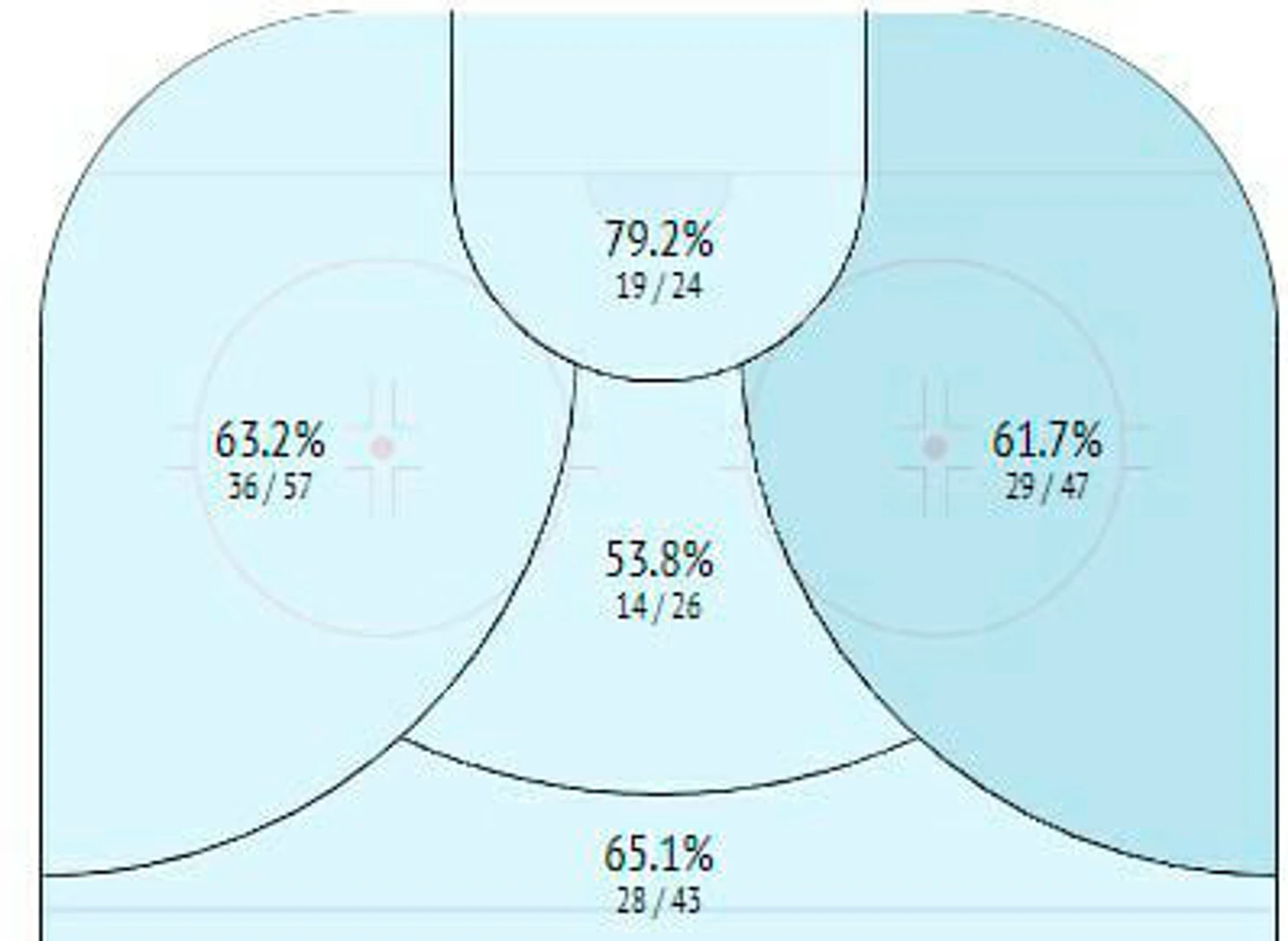 Все в норме – шесть шайб с пятака, но что настораживает: общее число бросков из этой зоны было не слишком высоким. «Трактор» вытеснял соперника на периметр, заставляя поливать из кругов вбрасывания – с Уфой будет еще сложнее.