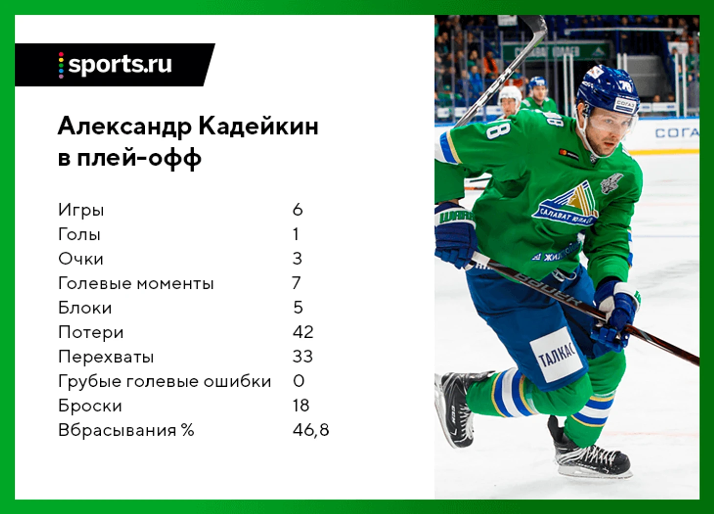 Болельщики из Уфы перед каждым матчем плей-офф хотят услышать три главных слова: «Кадейкин в составе». И это не шутки – номинальный ролевик провел серию против «Магнитки» на высочайшем уровне и легко разжевал Мозякина и двух старичков, выходивших с Сергеем в звене. В чистых цифрах это выглядит примерно вот так: