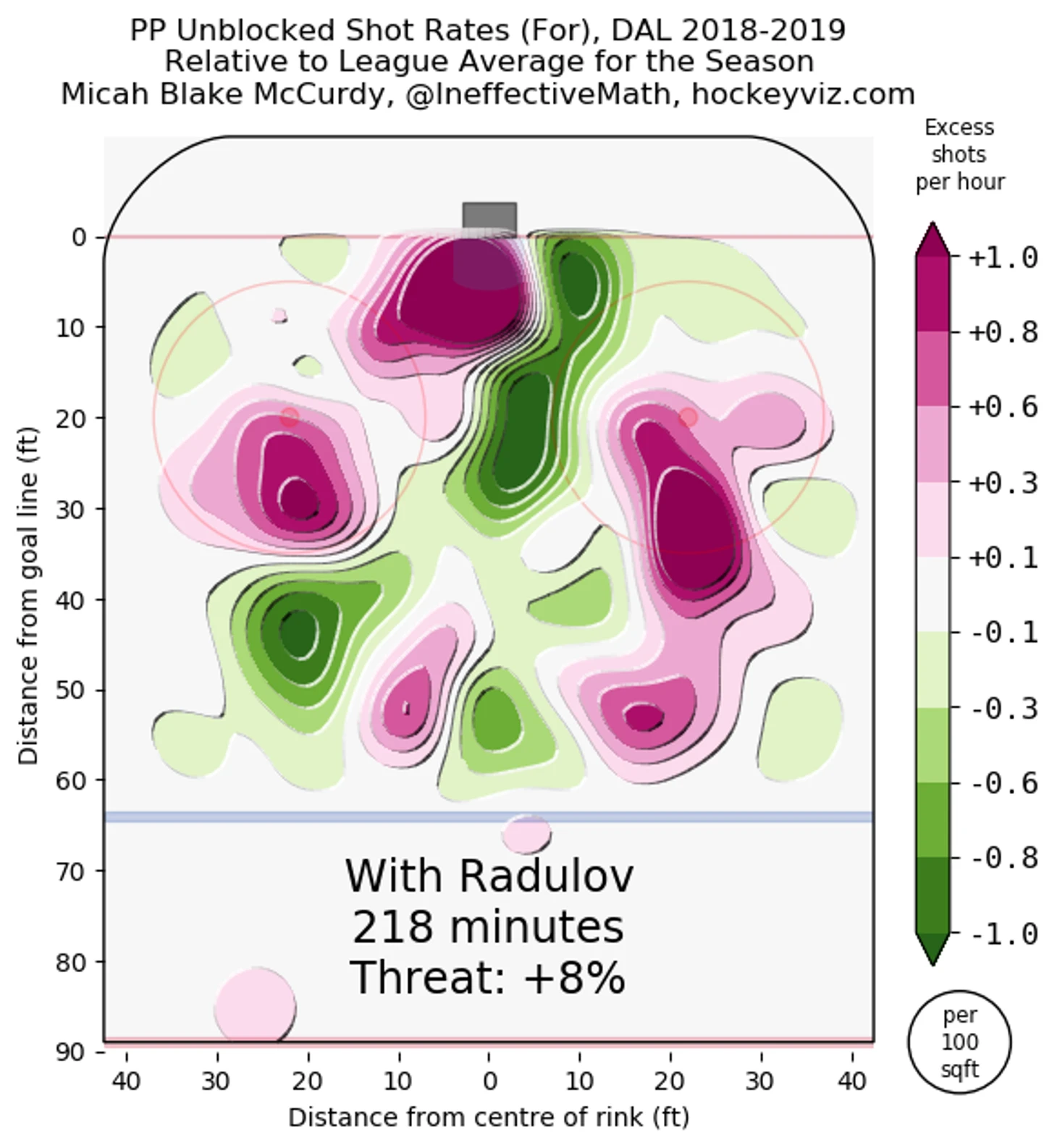 Чем темнее фиолетовый цвет, тем больше бросков наносится из этой зоны. В присутствии Радулова «Далласу» удается максимально загружать пятак и при этом задействовать броски из кругов вбрасывания после быстрых переводов. При этом Радулов не отмазывается от черновой работы – например, в схеме 1-3-1 он довольно часто играет на пятаке и закрывает обзор вратарю.